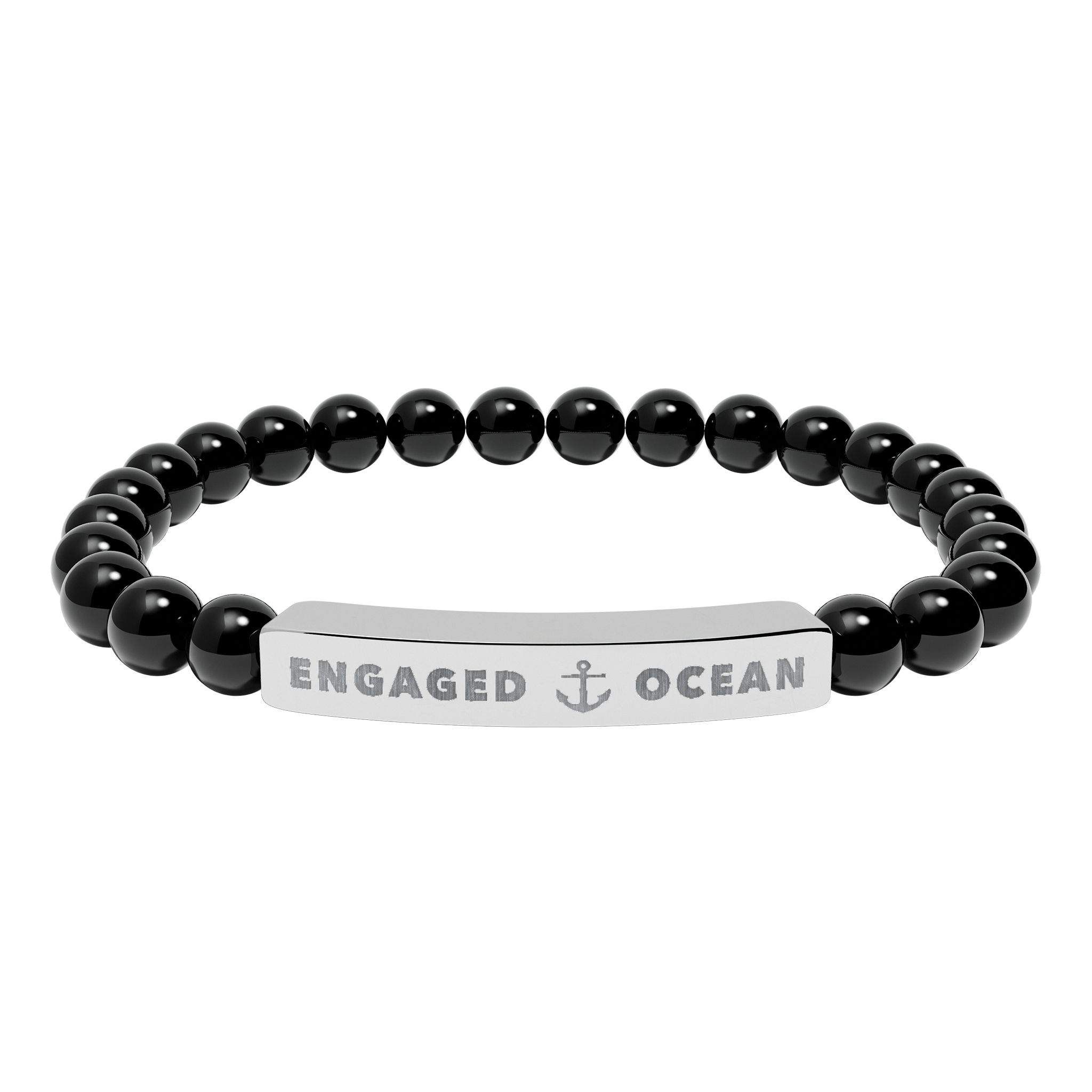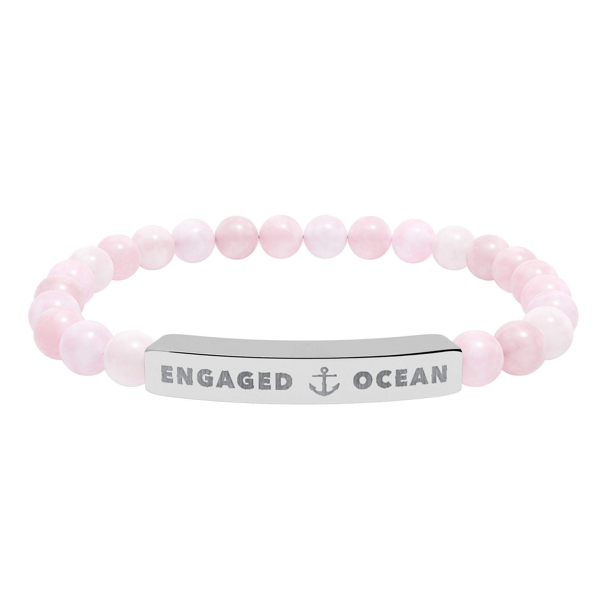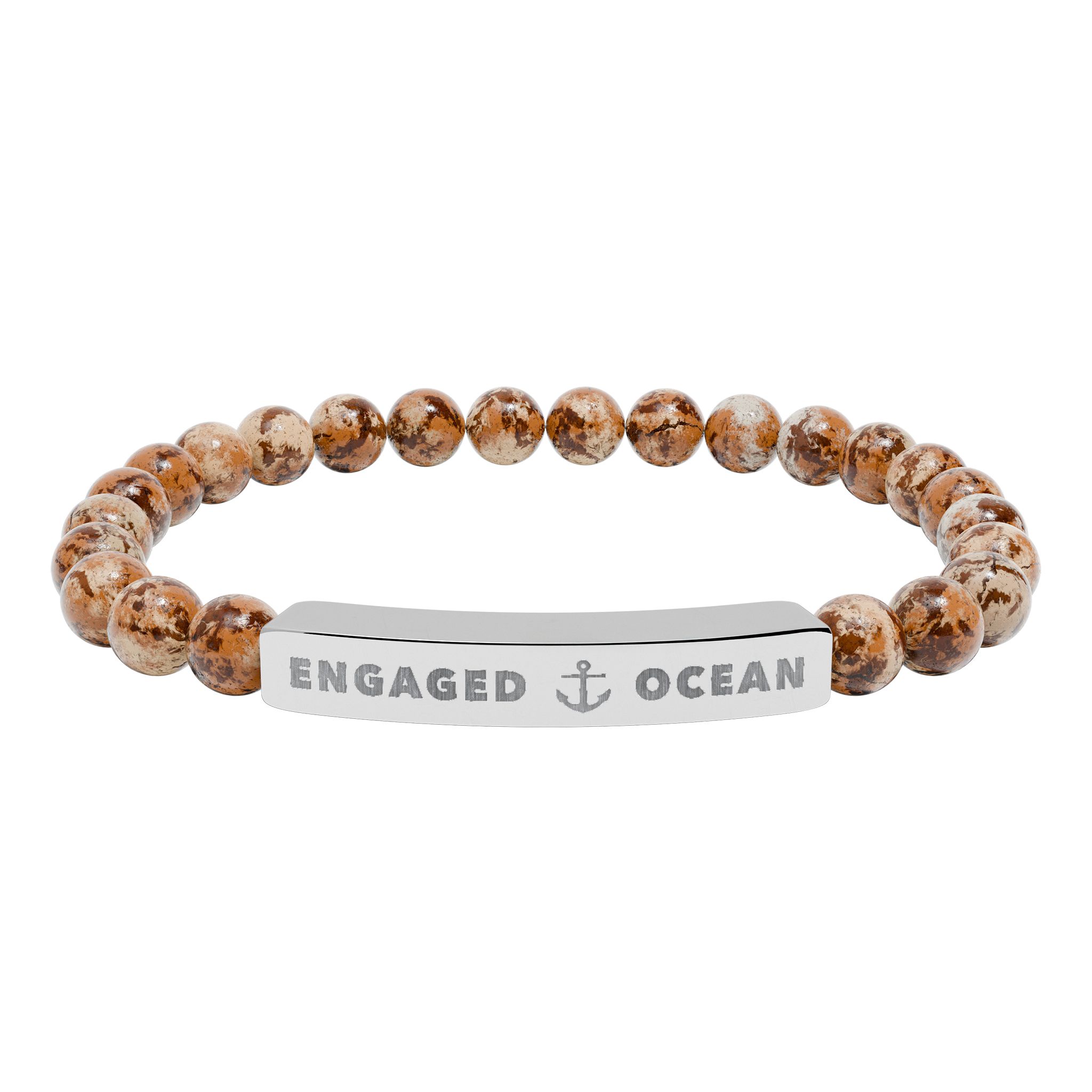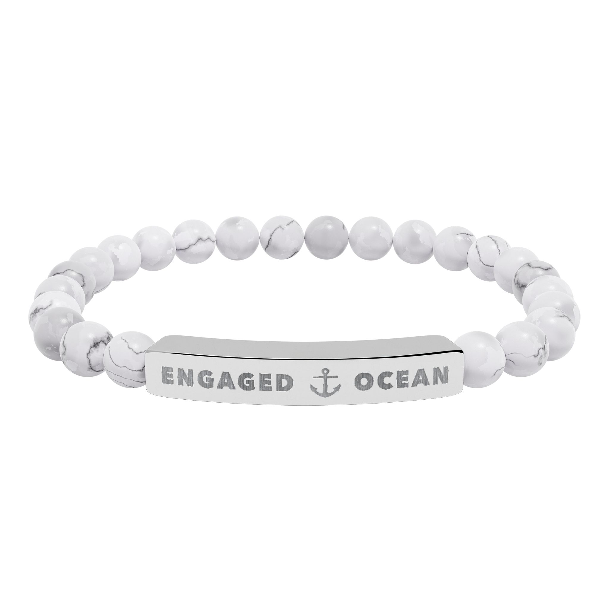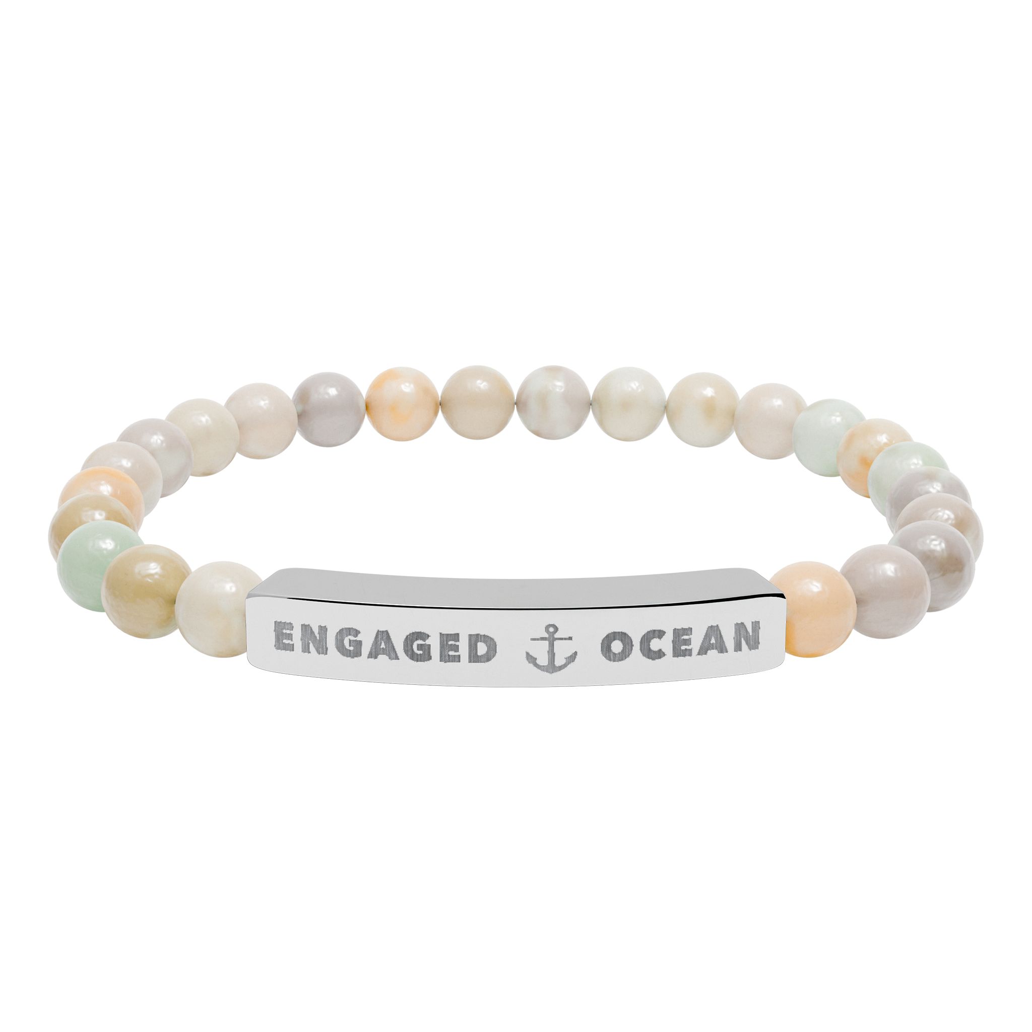 A calm, beachside-inspired stretch bracelet crafted from natural stone beads and anchored by a brushed stainless steel engraving plate. Each smooth bead carries soft, ocean-toned hues â from pale greens and sandy creams to marbled white â creating a subtle, wearable reminder of shorelines and quiet tides. The engraved plate features a crisp, permanent etching that reads with understated nautical charm. Lightweight and elastic, it slips on easily and sits comfortably for daily wear, whether youâre strolling a boardwalk or layering it with other bracelets at a sunset gathering. Packaged in a white gloss jewelry box with non-tarnish cotton fiber, it arrives ready to keep or give with a simple, personal touch.